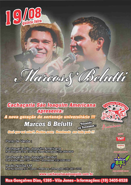 A dupla Marcos & Belutti se apresenta no dia 19/08/2010, quinta-feira na Cachaçaria São Joaquim em Americana/SP.
